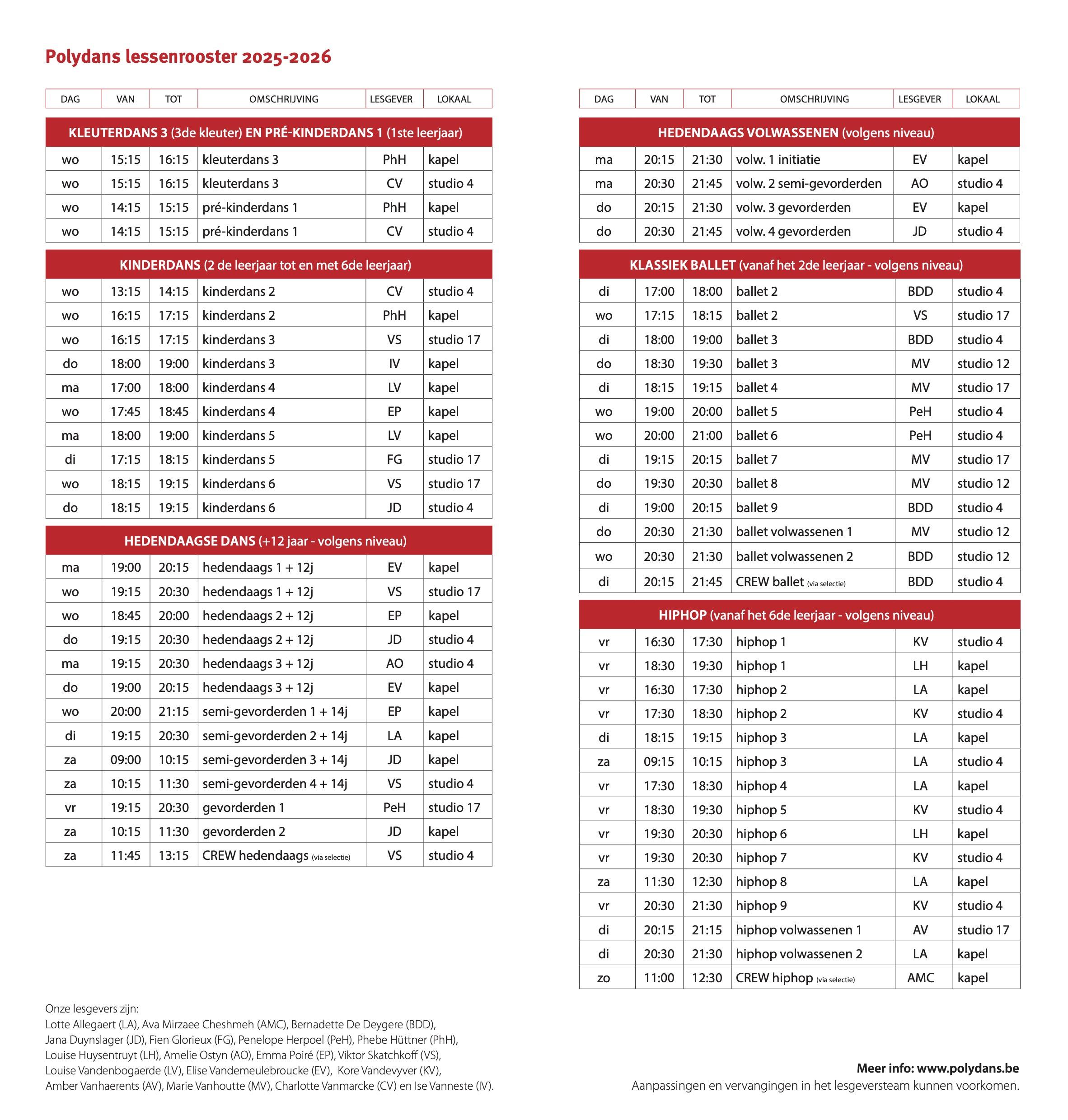Het lessenrooster voor het dansjaar 2025-2026 kan je hiervinden.