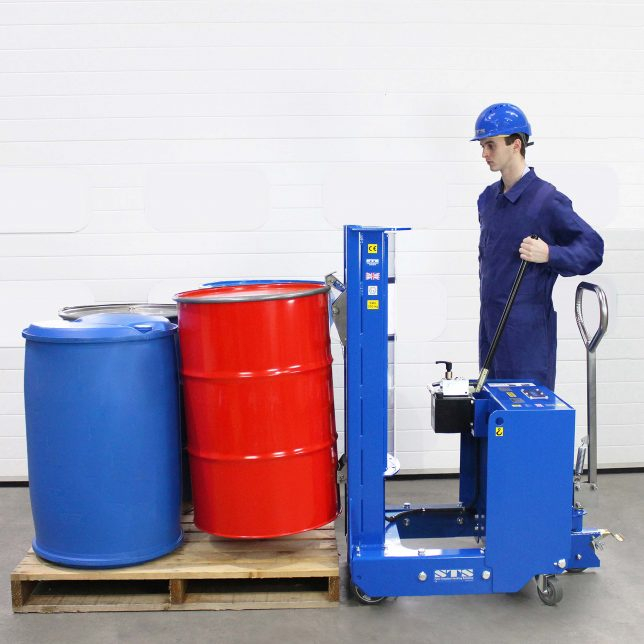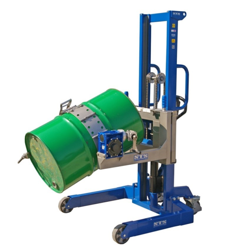 Grâce auxretourneurs de fûts STS, des fûts pesant jusqu'à 350 kg peuvent être soulevés, déplacés et basculés sans l'aide d'un chariot élévateur.