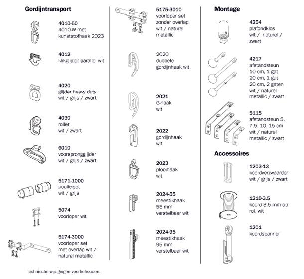 Glijder 4010 is verkrijgbaar met diverse haaksoorten. Heavy Duty glijder 4020. Voorsprongglijder 6010. Voorloper zonder overlap 5175-3010. Plafondbevestiging met plafondklos 4254.