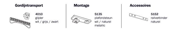 Goelst zelfsmerende glijders gemaakt van hoogwaardige kunststof, met een toevoeging van Teflon. Per meter 12 glijders 4010 (speciale zelfsmerende kunststof, UV gestabiliseerd). 1 poellie-set 5171-1000 en 1 voorloper met overlap 5174-3000 per lengte. Plafondmontage met metalen plafondsteunen 5135, aantal afhankelijk van de lengte. Koord met lushoogte 200m. Railverbinder 5152.