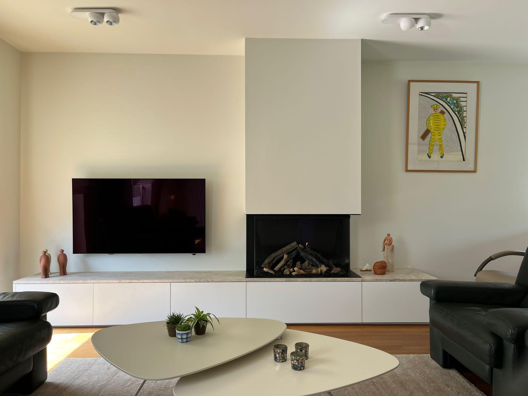 Er is een stijgende vraag naar een haardmeubel of haardwand met TV, ook daar kunnen we jou bij helpen. Gezien we technologische apparatuur verwerken rond de haard moeten we met een aantal zaken rekening houden. Soms krijgen we ook de vraag of we rondom de haard een bureauruimte kunnen maken. Veel meer mensen werken vaker van thuis, waarom dan niet gezellig bij de haard?