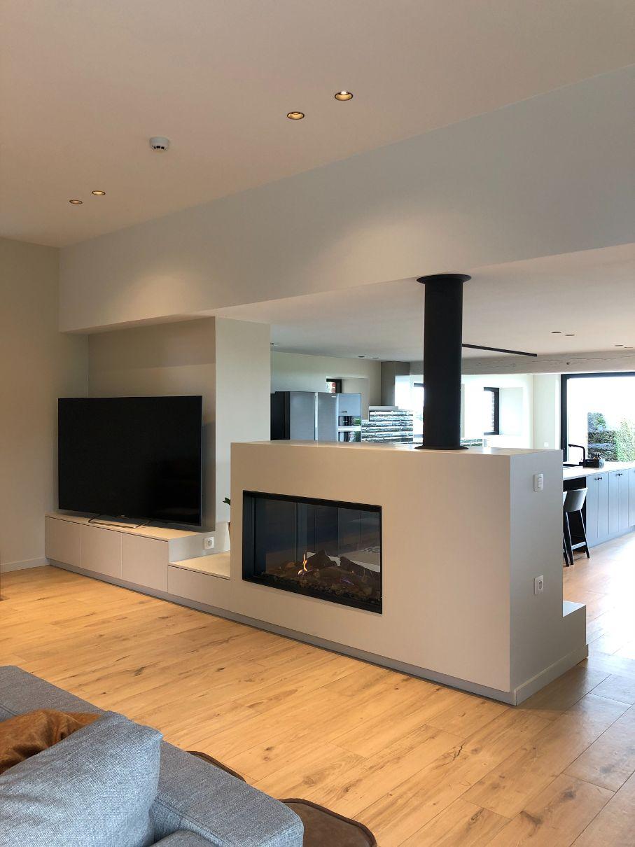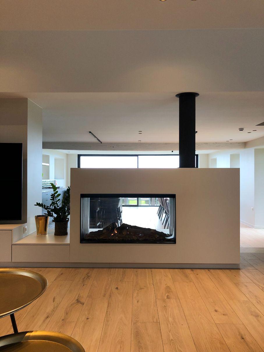 Een room divider is een doorkijkhaard met glas aan 3 zijden. Het gaat dus om een muur die een ruimte opsplitst in 2 delen zonder dat dit afzonderlijke kamers zijn. Dit gaat meestal om een kort muurtje dat weinig functie heeft, maar dat met een doorkijk openhaard een spectaculair visueel element toevoegt aan je woonkamer. Laat je inspireren door onze interieurvormgever en zijn ideetjes voor jouw woonruimte. Het team van Verbeke haarden heeft alles in huis om je project te doen slagen.