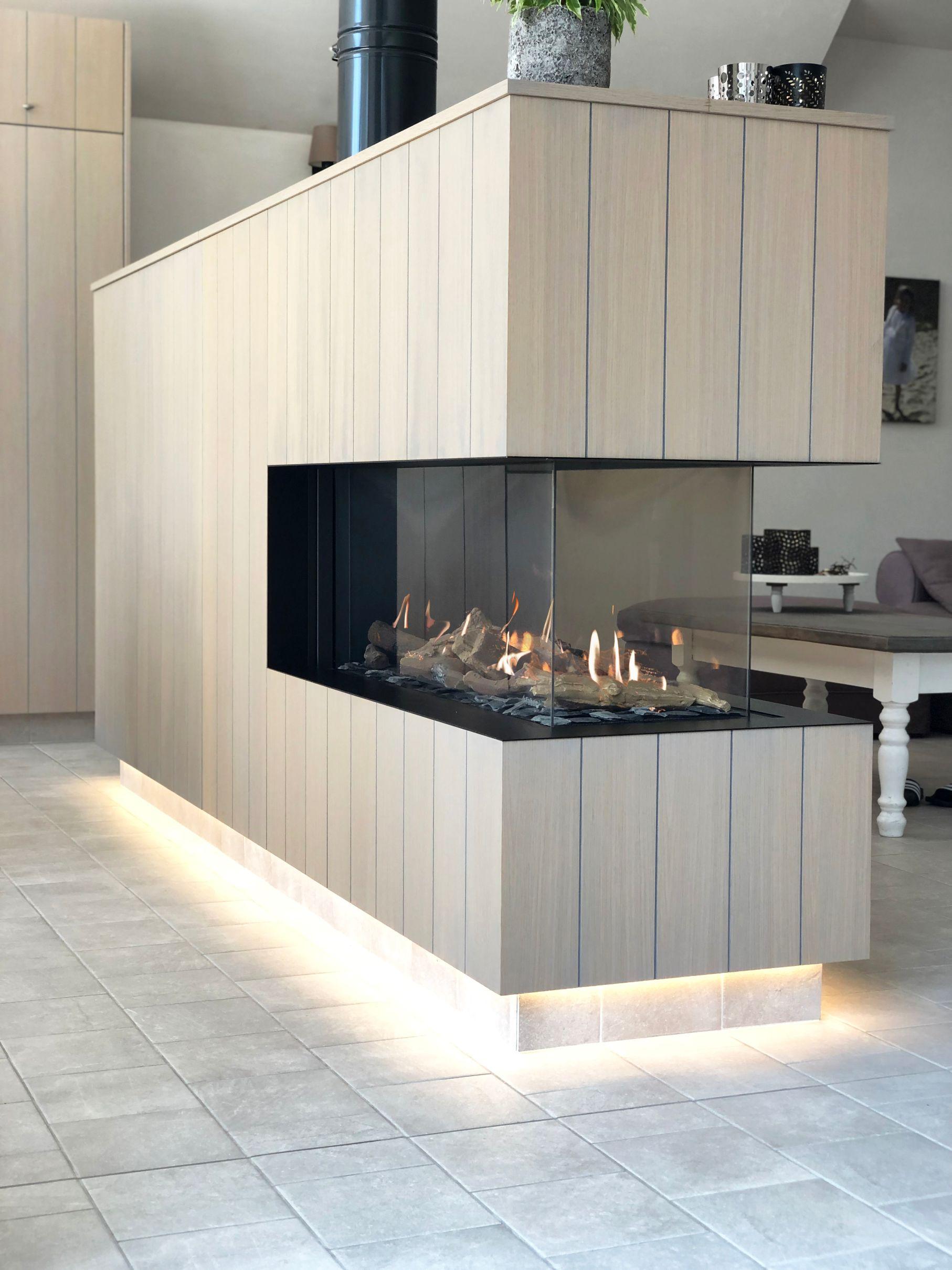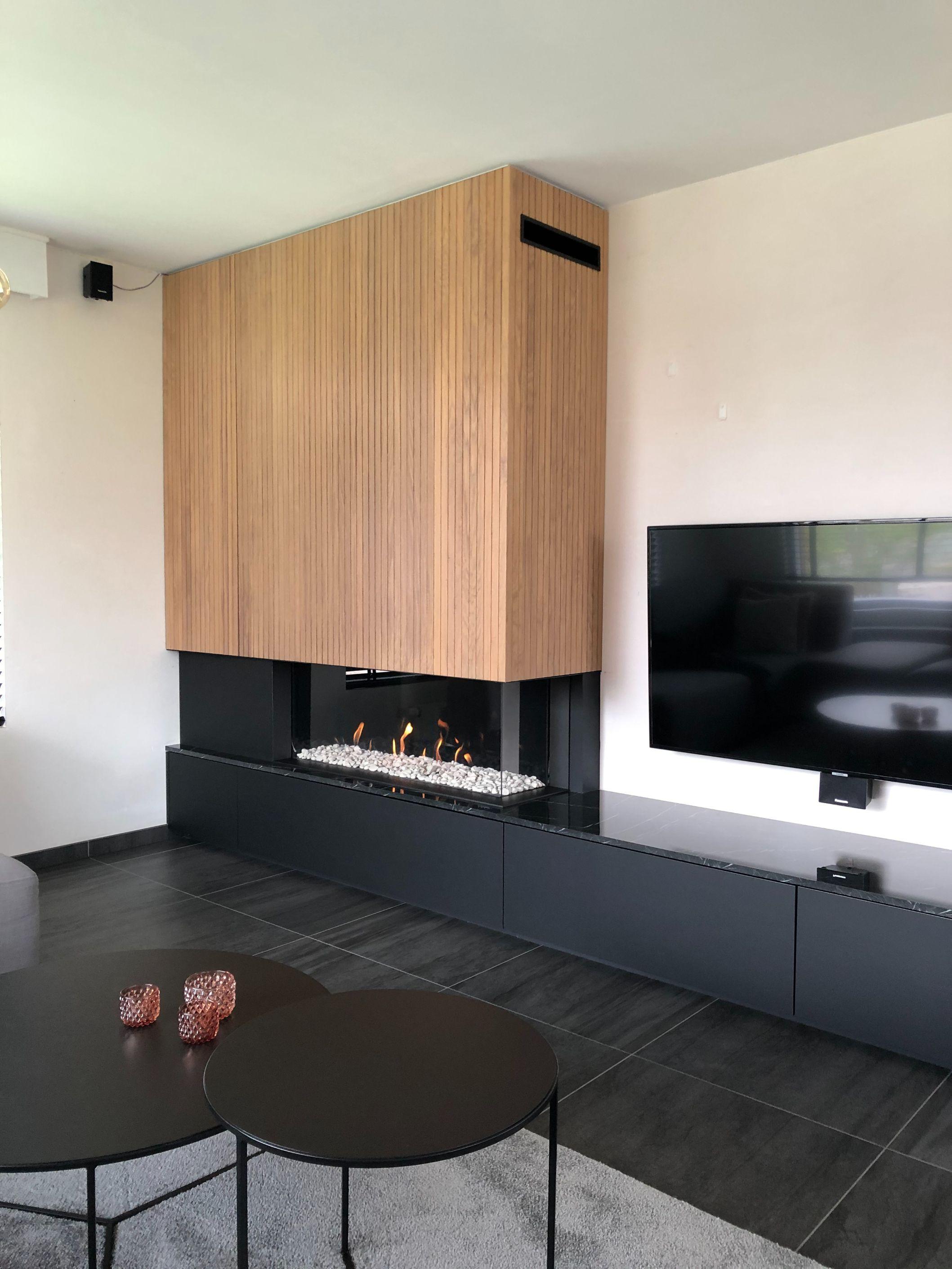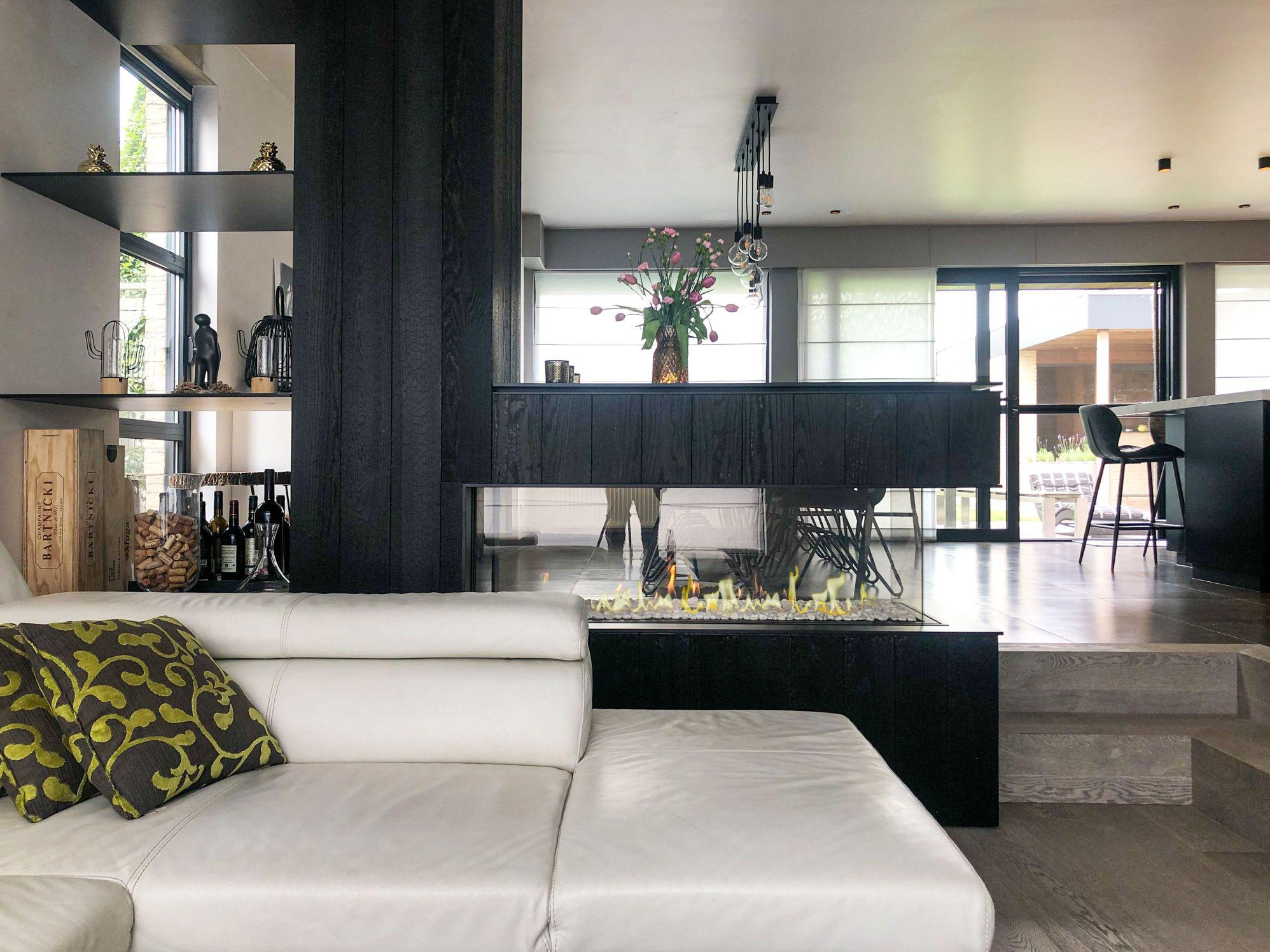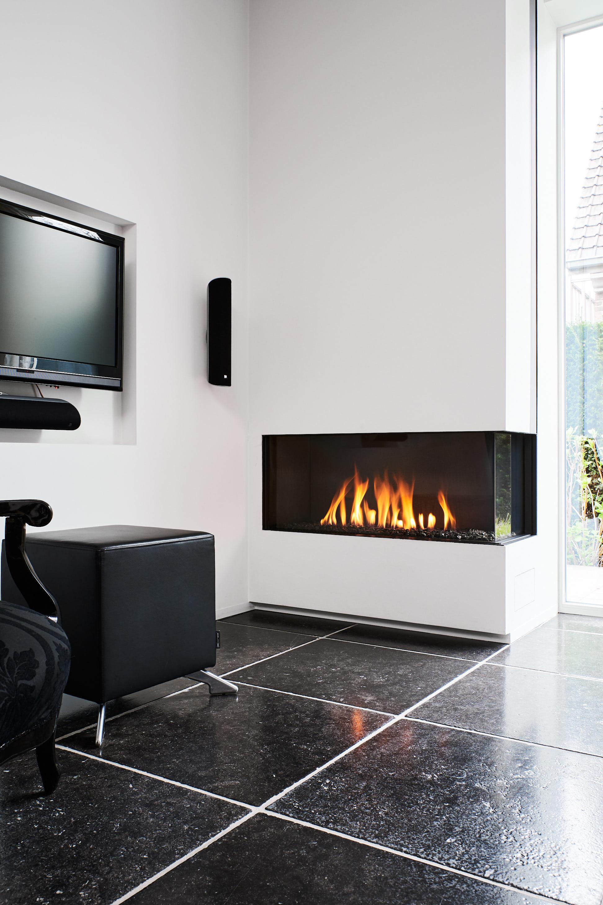 Een hoekkachel leunt dicht aan tegen de doorkijkhaard.
