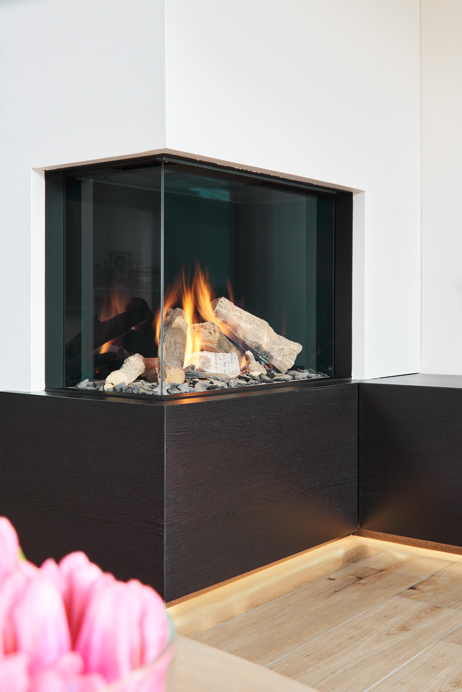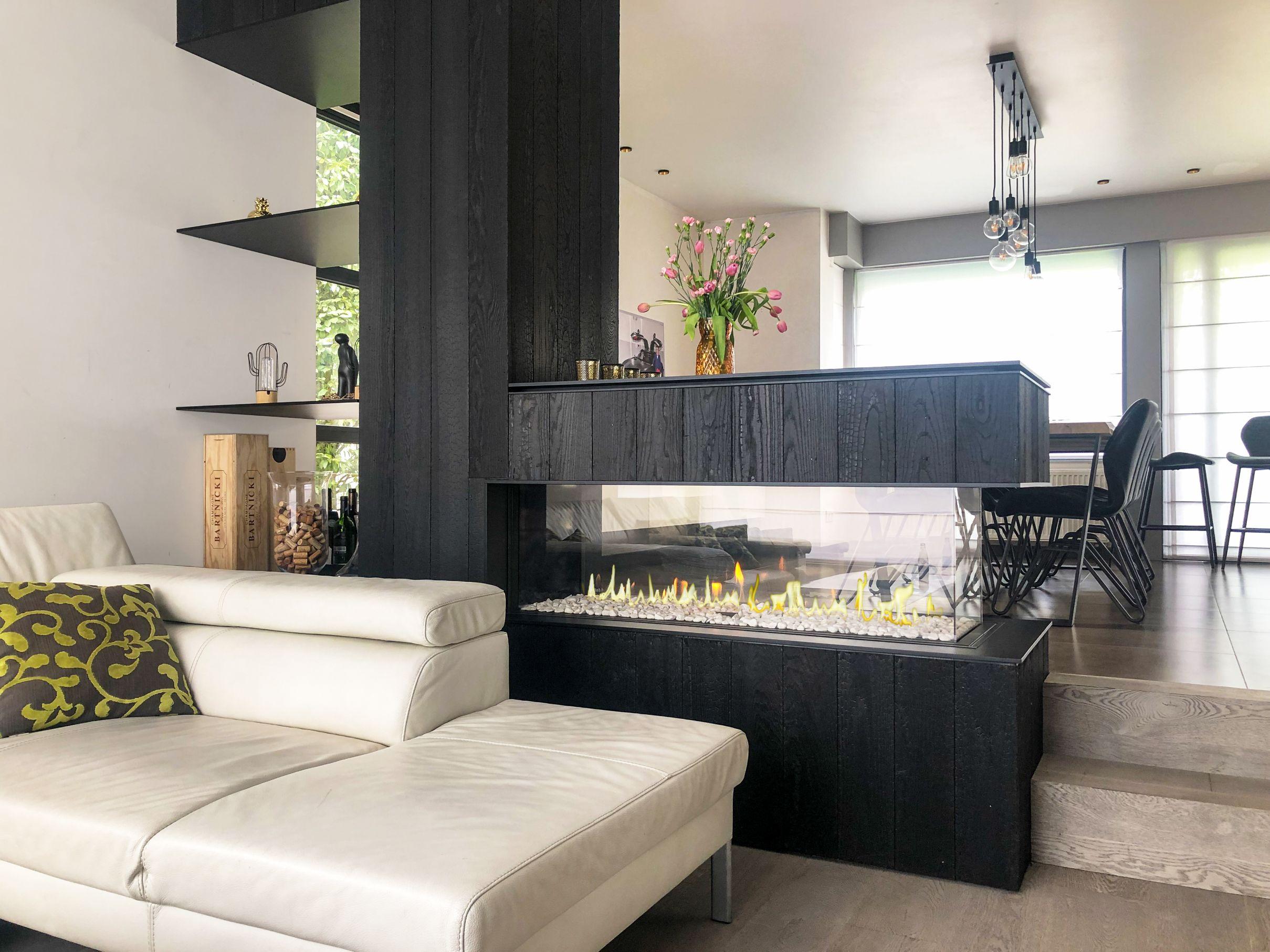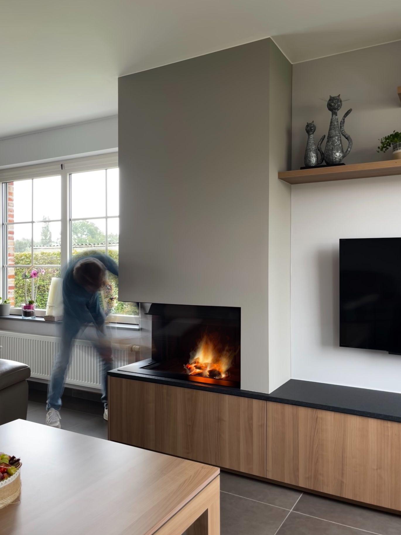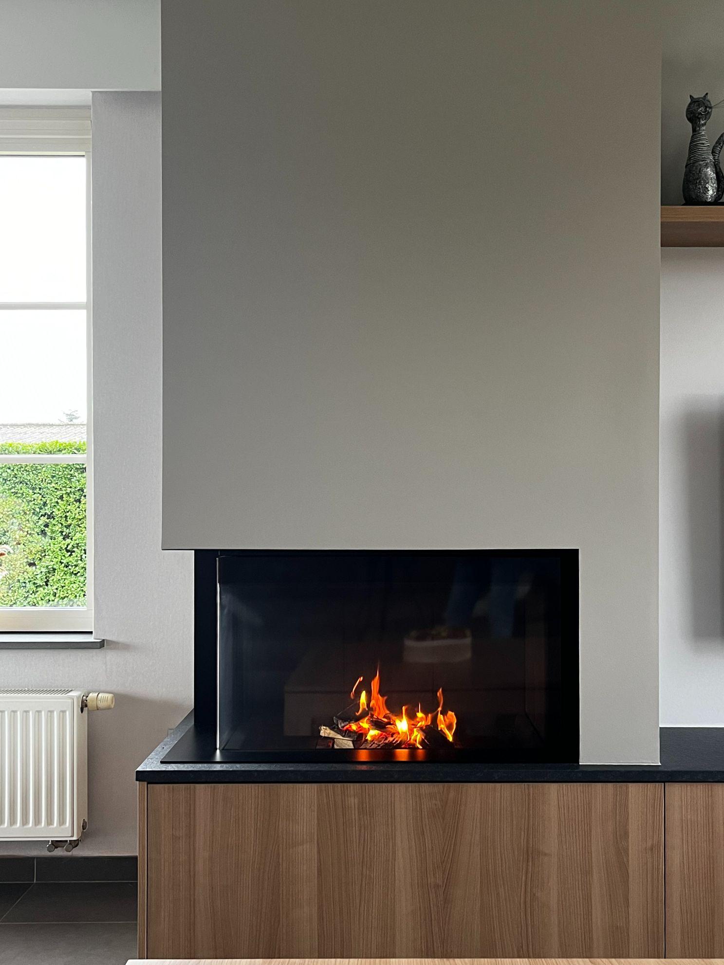 Een hoekkachel leunt dicht aan tegen de doorkijkhaard.
