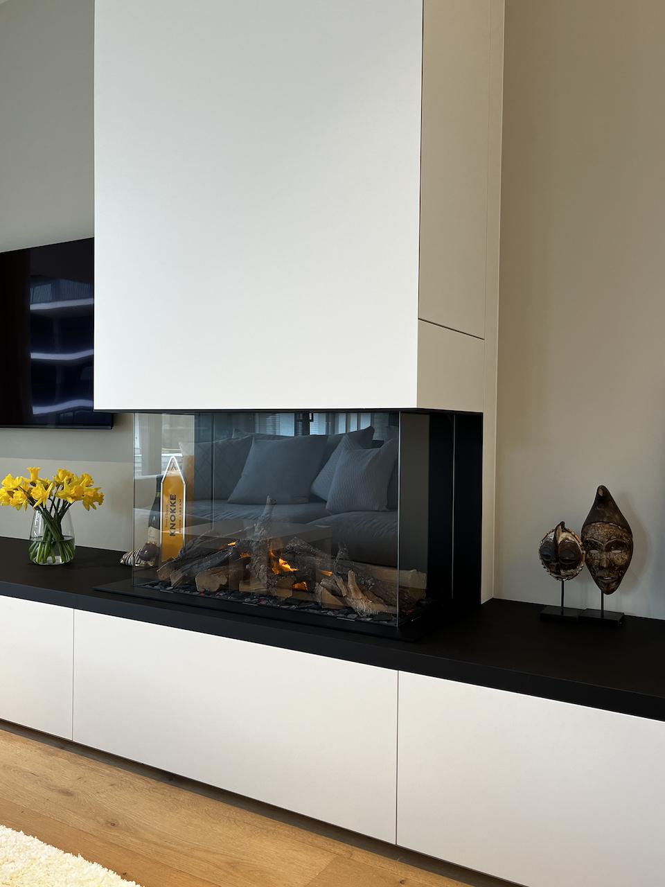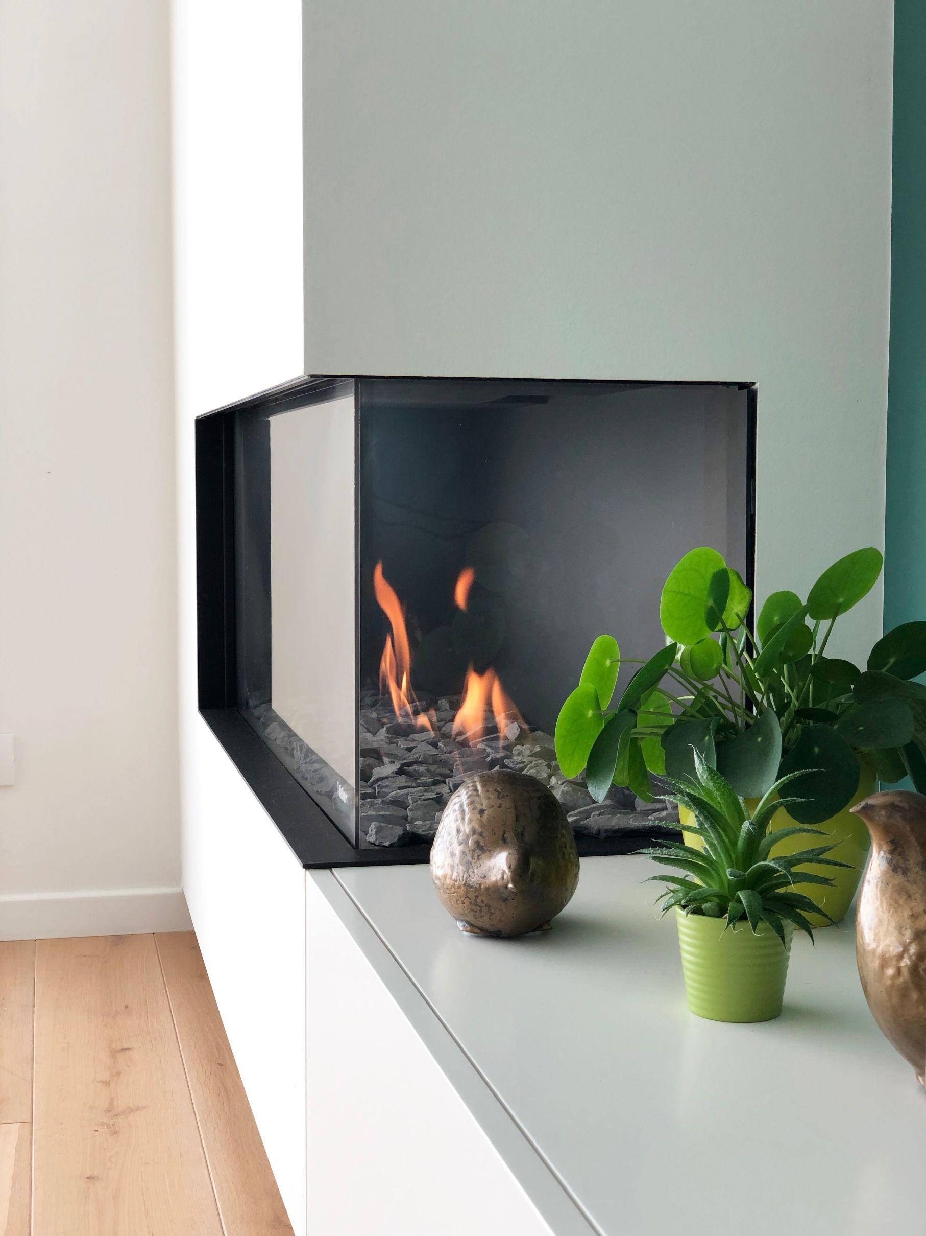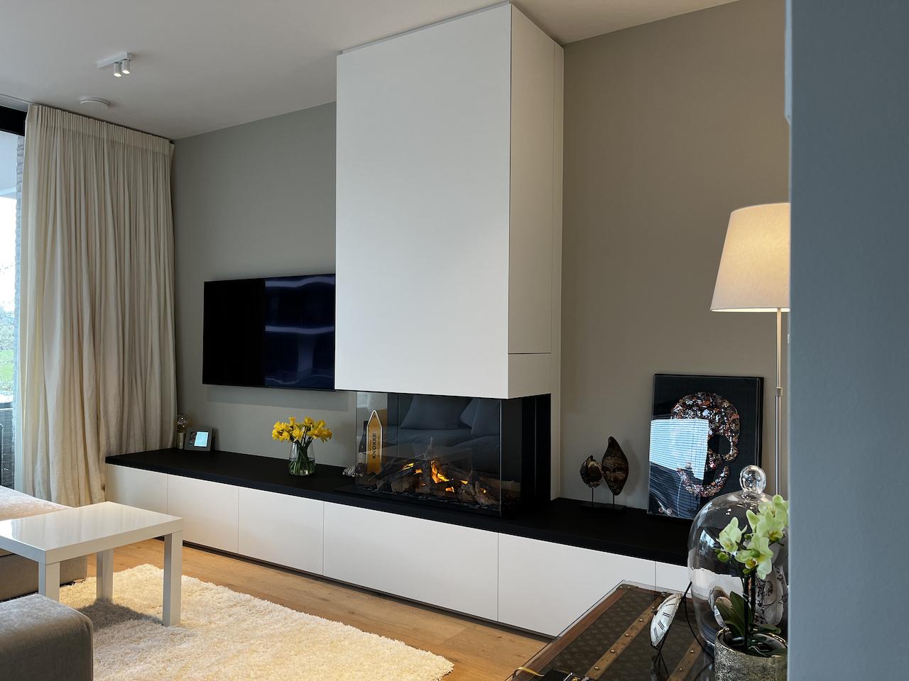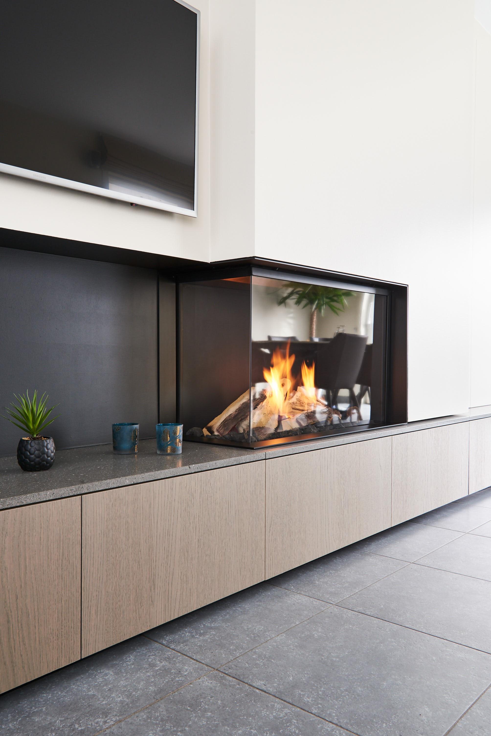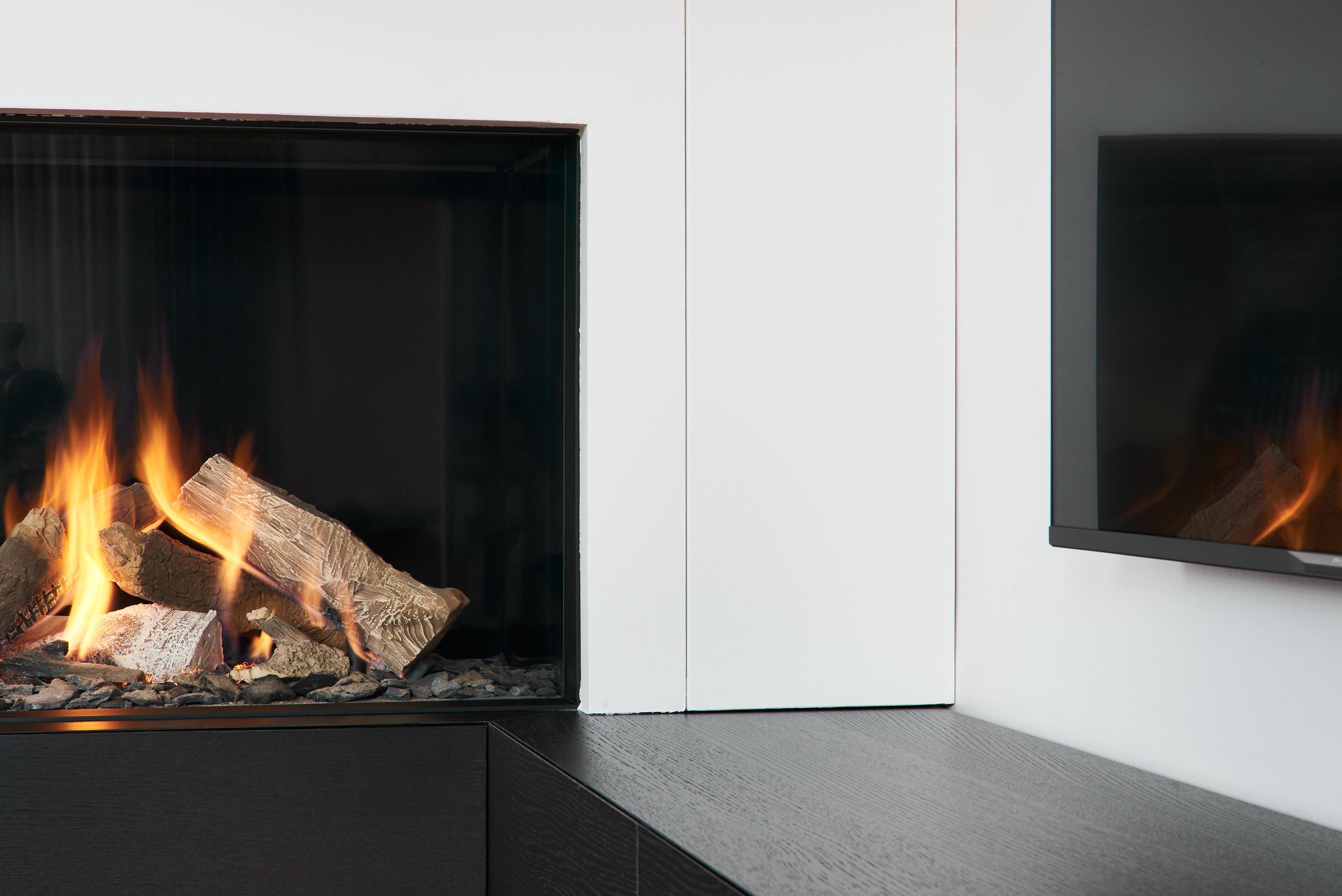 Een hoekkachel leunt dicht aan tegen de doorkijkhaard.