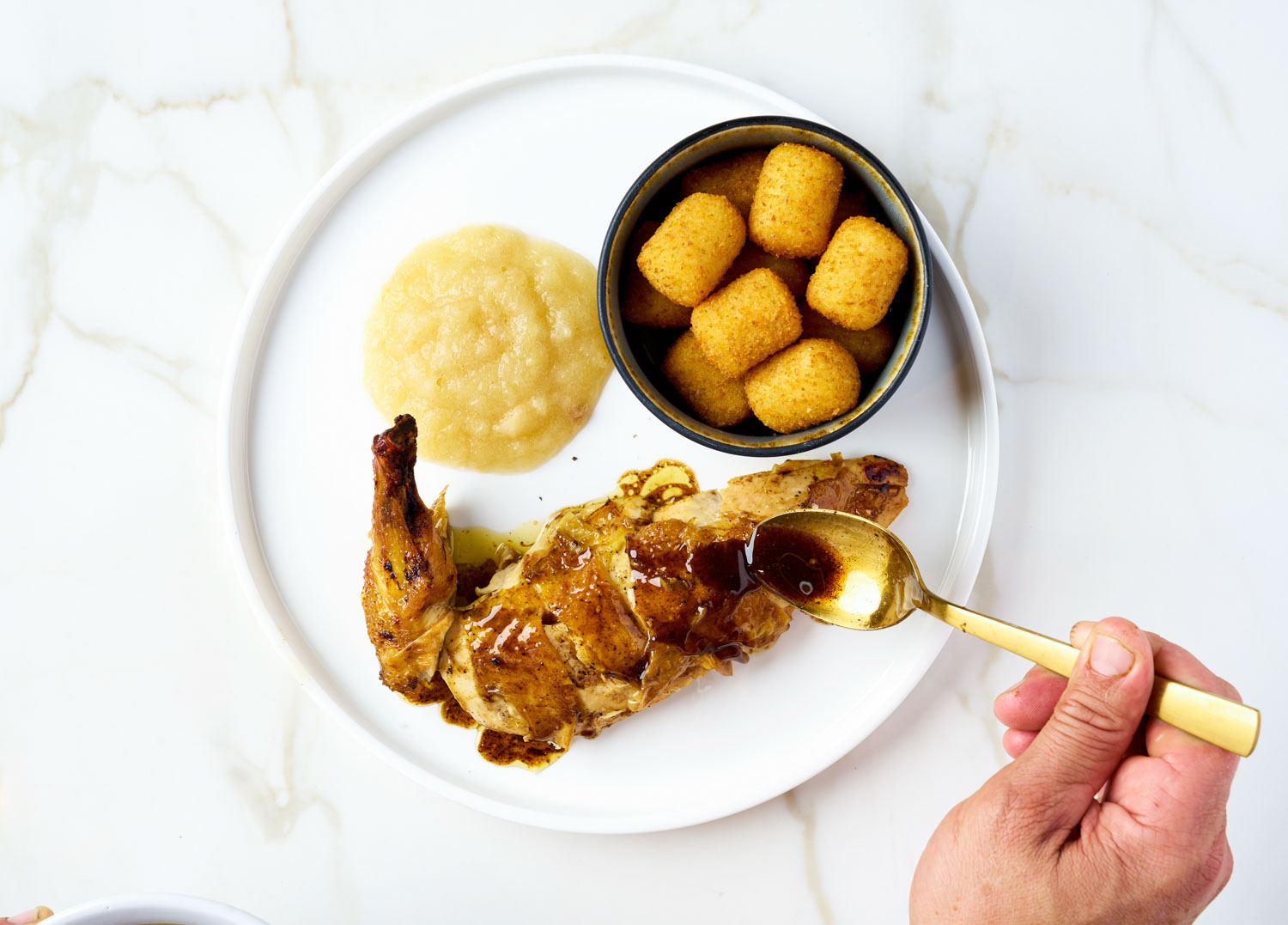 Dit gerecht is een echte Vlaamse klassieker: mals gebakken hoevekip met natuurlijke jus, appelcompote en krokante kroketjes van Vanderhaegen. Authentiek comfortfood.