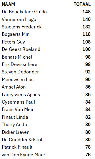 Een jaar is weeral om. Proficiat aan Guido De Beuckelaer, Hugo Vannerom en Frederick Staelens die het hoogst eindigden in de ladderstand na de quizzen van 2025. Zij mogen een prijs van de VBL bridgeboetiek thuis verwachten en beginnen terug onderaan de ladder. Benieuwd naar je prestaties in de lopende competitie? Bekijk de actuele ladderstand hiernaast