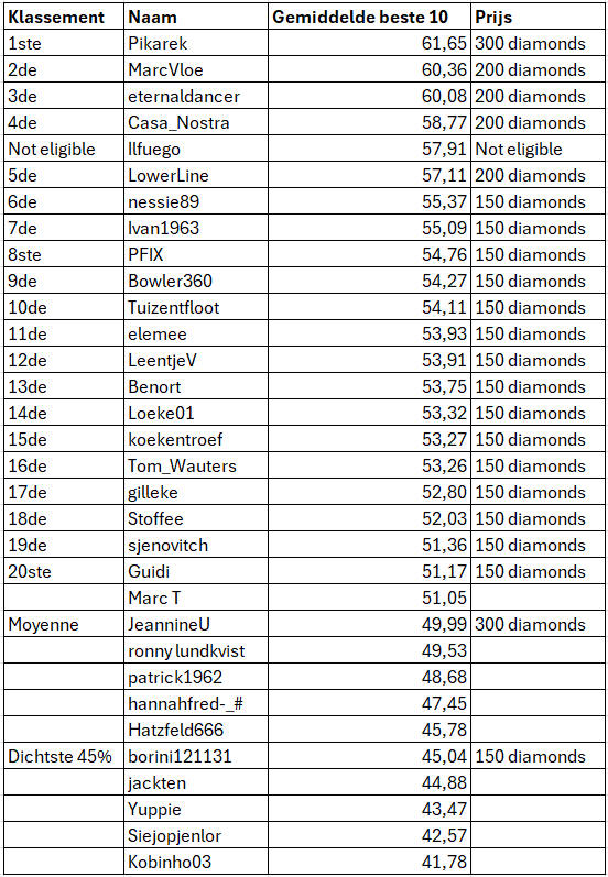 Alle behaalde punten blijven tellen, behalve de punten van degenen die in de prijzen gevallen zijn. Die beginnen terug vanonder. Zo kan Iedereen een prijs winnen, meedoen is de boodschap.Zie hiernaast voor de huidige ladder-stand
