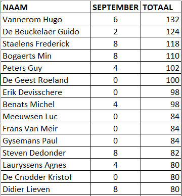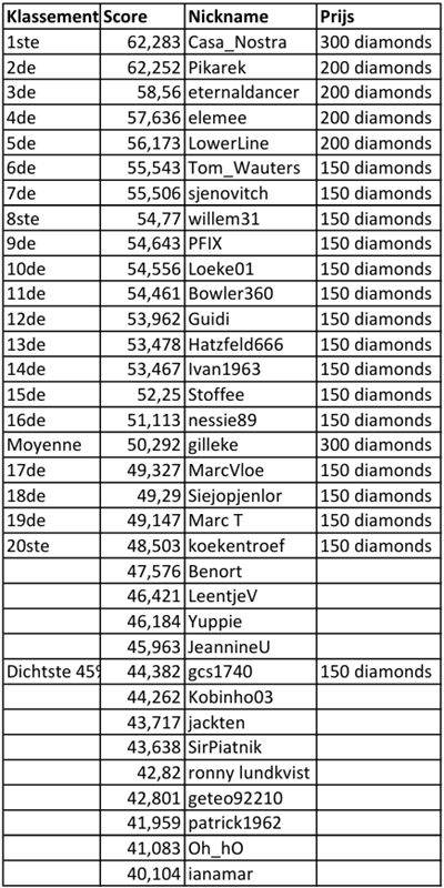 Alle behaalde punten blijven tellen, behalve de punten van degenen die in de prijzen gevallen zijn. Die beginnen terug vanonder. Zo kan Iedereen een prijs winnen, meedoen is de boodschap.Zie hiernaast voor de huidige ladder-stand