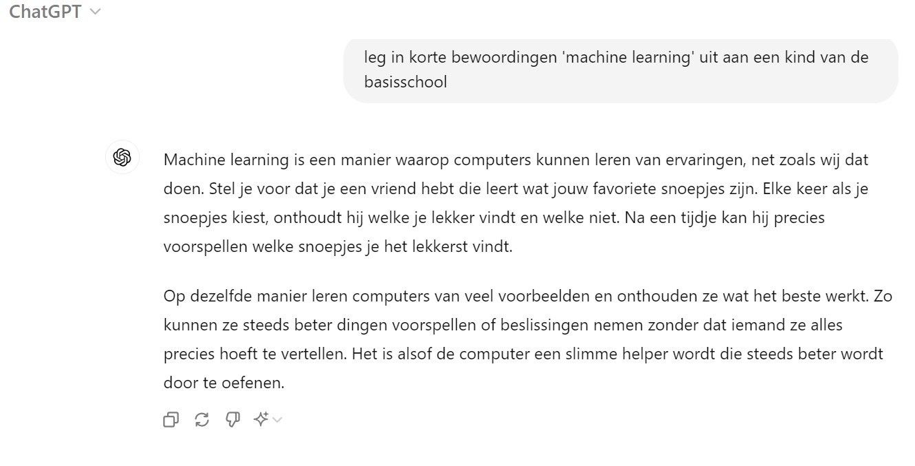 ChatGPT: Machine learning is een manier waarop computers kunnen leren van ervaringen, net zoals wij dat doen. Stel je voor dat je een vriend hebt die leert wat jouw favoriete snoepjes zijn. Elke keer als je snoepjes kiest, onthoudt hij welke je lekker vindt en welke niet. Na een tijdje kan hij precies voorspellen welke snoepjes je het lekkerst vindt.